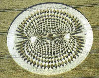 Fig. 3.25 ‘Sun wheel’, 300 feet across, Silbury Hill, 3/4 August 2004. This formation appeared in outline the first night, and was completed the next night. Some researchers assume that this means it must be man-made, but there is no conclusive evidence of this.