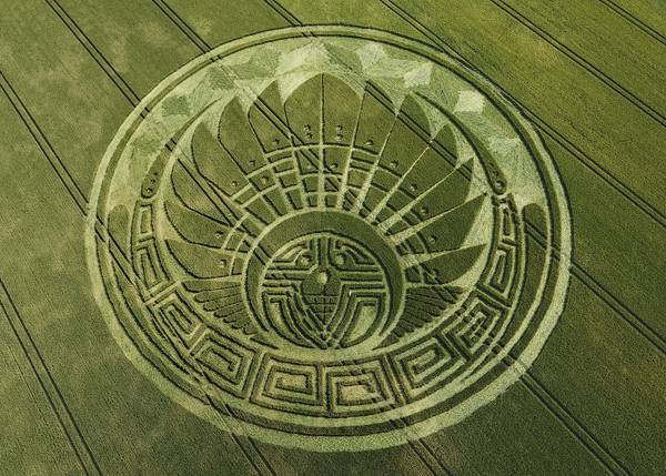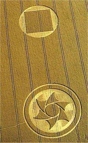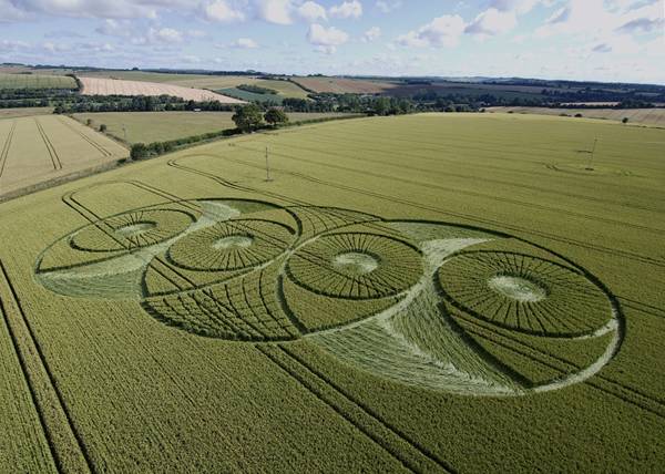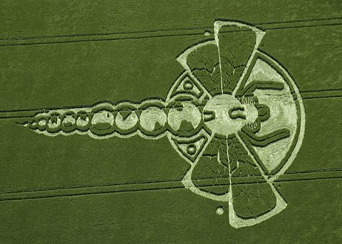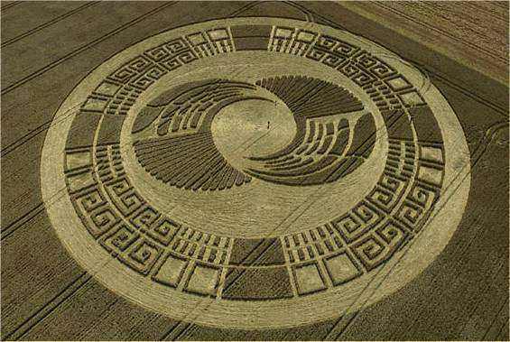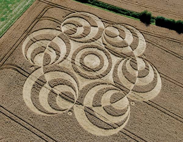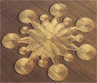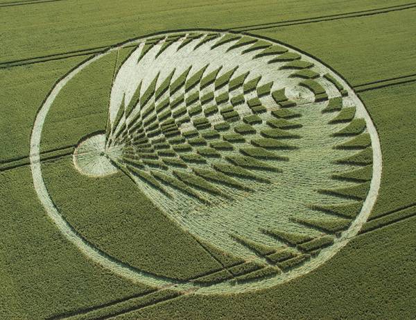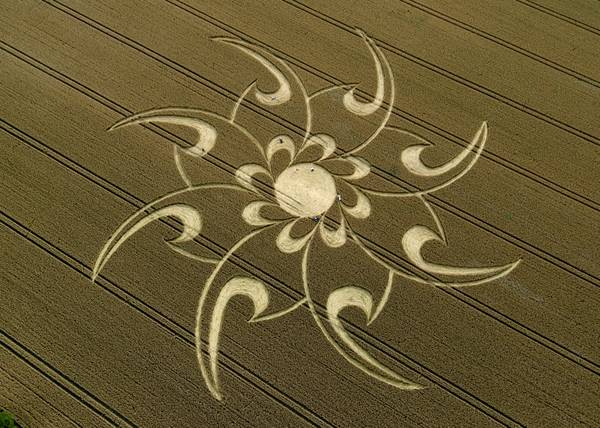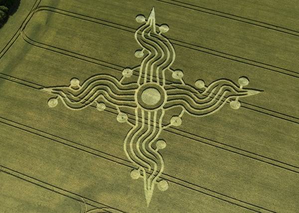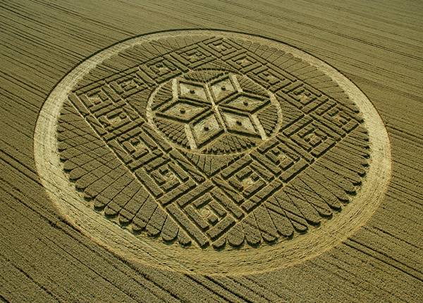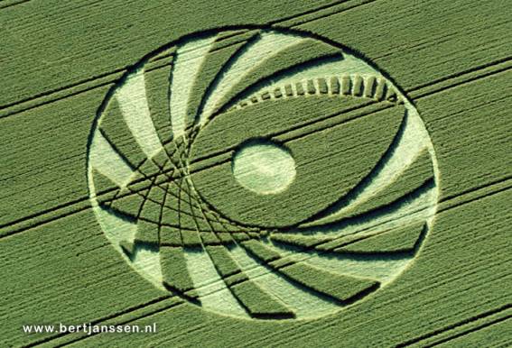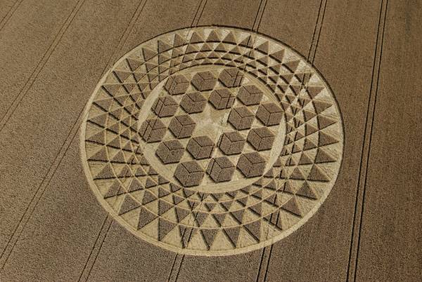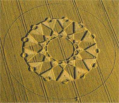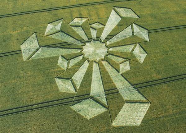 1990 saw the first pictograms, consisting of long chains of circles, rings, rectangles, straight lines, and tridents, ‘keys’ or ‘claws’. Whales/dolphins and insectograms began to appear the following year. Crop glyphs from 1994 included ‘thought bubbles’, which by incorporating crescents mutated into glyphs resembling spiders and scorpions. That year also saw the first astronomy-related glyphs, which include galaxies, asteroid belts and planetary orbits. Since the late 1990s the formations have developed into spectacular and incredibly complex geometrical designs or mandalas. Sevenfold geometry first appeared in 1998, ninefold geometry in 1999, elevenfold geometry in 2000, and thirteenfold geometry in 2003. Since 1999 several crop formations have created the illusion of being three-dimensional.