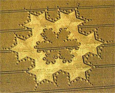 Fig. 3.12 ‘Koch fractal’, Milk Hill, Wiltshire, 8 August 1997. Two engineering firms estimated that staking out the 346 reference points required to construct the 71-metre-wide design prior to flattening the wheat would take 6.5 to 7.5 days, or 11 days if done under cover of darkness. Yet the formation had definitely appeared overnight.