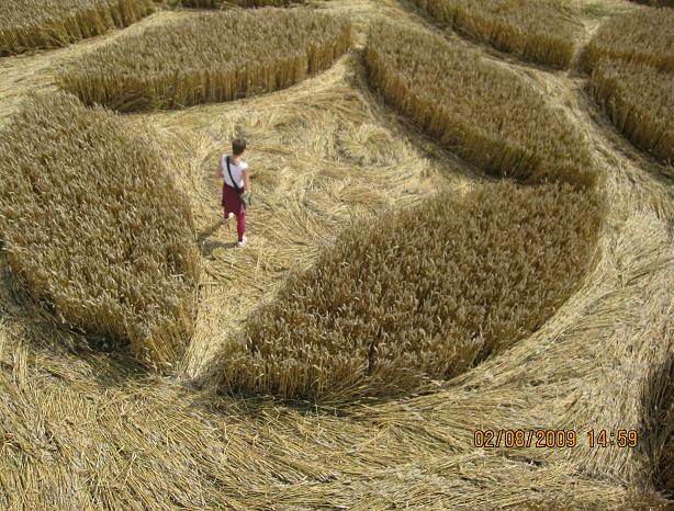 In the best ‘authentic’ crop circles, the flattened plants tend to be largely undamaged (until visitors arrive!) and to continue growing, whereas in hoaxed circles the stalks are generally broken, crushed and often killed. The stalks of flattened vegetation in genuine formations are bent at angles of up to 90 degrees, and are often laid in a strikingly intricate and beautifully woven fashion.
