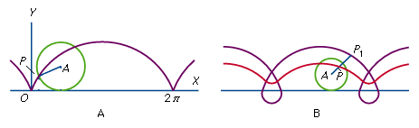 A trochoidal curve is one generated by a point anywhere on a straight line that passes through the centre of a rolling circle. For a cycloid (diagram A), this point (P) is located on the rim of the circle. The purple and red curves in diagram B are prolate and curtate cycloids respectively, the distance A-P1 being greater than the radius of the rolling circle, and A-P being shorter.