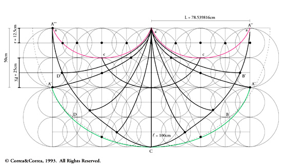 They argue that if a pendulum is released from 90° to the vertical, and the isochronous requirement is still to hold, the pendular swing will have to take the form of a gothic arch. The amplitude (i.e. the pendulum length) of the gothic arch (A''-C-A''') shown in the diagram below is 100 cm, the length of the org-seconds pendulum; the arc is generated by four synchronized rolling circles. The pendulum length is equal to the curvilinear length of the red cycloid and to four times its amplitude. Given that at 90° to the vertical the pendulum length wraps itself around the cycloidal wave exactly, this wave becomes equivalent to the free massfree waveform of the pendulum length; every gravitational pendulum therefore has a specific wavefunction intrinsic to its swing.