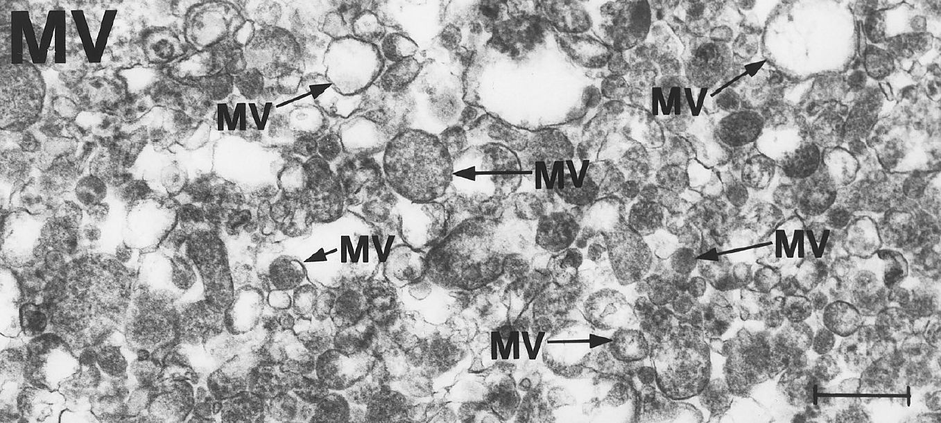 Electron micrographs published by Bess et al. (1997). Particles marked ‘MV’ are said to be normal microvesicles and those marked ‘V’ are said to be HIV. The top image is from an ‘infected’ cell culture, and the lower one is from an ‘uninfected’ cell culture. However, the latter is not a valid control experiment because, unlike other cultures, it was not irradiated, and radiation can cause the appearance of retrovirus-like particles.