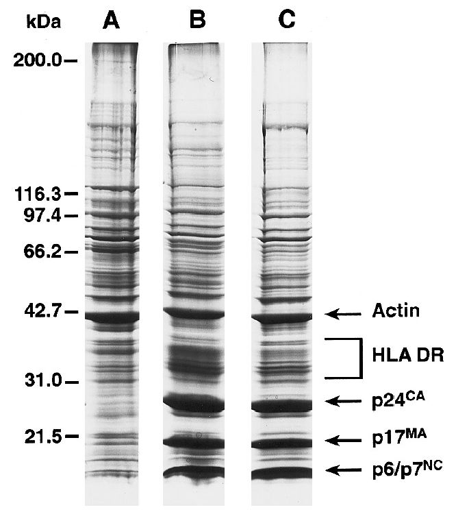 Protein profiles for 1.16 g/ml material from an ‘uninfected’ cell culture (A) and from ‘HIV-infected’ cell cultures (B and C). Actin and HLA DR = cellular proteins; kDa = molecular weight scale. (Bess et al., 1997)