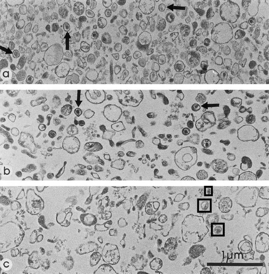 None of the electron micrographs published by Gluschankof et al. (1997) shows purified ‘HIV’. The particles marked by arrows in the upper two images (a and b) are supposedly HIV-1; the other particles are cellular microvesicles. The third image (c) is from an ‘uninfected’ cell culture, but the particles in black boxes resemble the alleged ‘HIV’ particles.