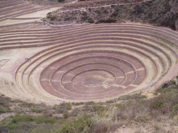 Fig. 1.4 Terraces at Moray. The tiered basin is 183 m wide and 79 m deep. The 12 terraces are stabilized by stone walls, some as high as 7.5 m. The first six terraces are thought to have been made by the pre-Inca Wari people, who occupied the region from around 600 to 1100 AD. Some think Moray was a ritual complex. Others believe it was a huge agricultural laboratory where different soils, plant varieties and temperature regimes were tried out. The structure of the basin produces a range of different soil temperatures.3
