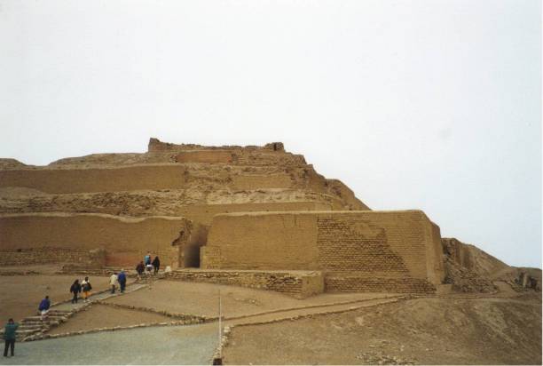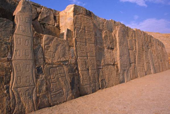 The Nazca (or Nasca) culture inhabited the coastal valleys of southern Peru from the 1st to 8th centuries AD. They constructed mudbrick pyramids up to 30 m high, and made beautiful polychrome pottery. They are widely believed to have made most of the Nazca ‘lines’ – vast geometric and animal figures etched into the desert floor (see section 4). The main ceremonial centre was Cahuachi, a site covering 1.5 sq km and containing over 40 mounds (modified natural hills) topped with adobe structures.