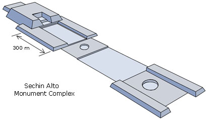 With a U-shaped monument plan covering about 200 ha, it is one of the largest constructions ever built in Prehispanic America. Five plazas extend 1.4 km from the central mound, three with central sunken courts, one of which is about 80 m in diameter. The main mound is 44 m high by 300 m by 250 m, making it the largest single construction in the New World during the second millennium B.C. The mound was faced with granite blocks, some weighing over 2 tons.12