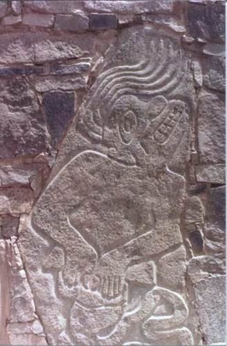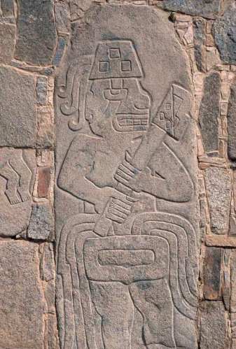 The Chavín culture occupied the northern Andean highlands of Peru, about halfway between the tropical forests and coastal plains.16 It flourished from 900 to 200 BC, but formative phase of Chavín culture in various regions of Peru date back to 1600 BC. For a long time it was considered to be the first Peruvian civilization. The Chavín people cultivated crops using an irrigation system, tamed llamas, developed the techniques of gold, silver and copper metallurgy, and produced beautiful gold artefacts. They also made exquisite textiles, ceramics and musical instruments. Chavín art forms make extensive use of a technique known as ‘contour rivalry’. The 7-foot-high Raimondi stela, made of polished granite, is one of the finest examples of this technique. The art is difficult to understand because it was intended to be read only by high priests. Some sculptured heads have mucus pouring from the nose, something that happens when certain hallucinogenic drugs are used.