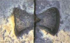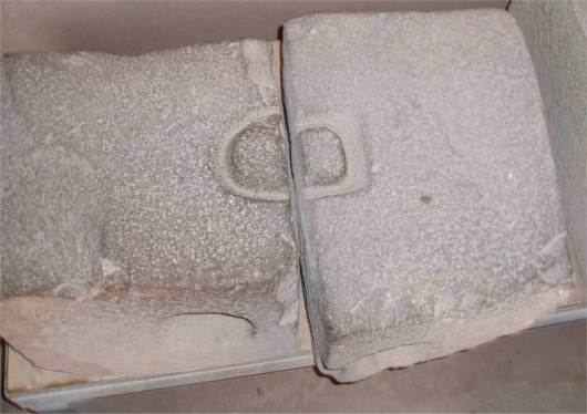At Tiwanaku and Puma Punku selective use was made of metal clamps or ties. For instance, the side walls of the water channels in the Akapana and at Puma Punku are built with upright stone slabs held together with I-shaped clamps. Protzen thinks this was to hold the slabs in the proper alignment. Clamps also once pieced together the enormous sandstone slabs used in the construction of the four platforms at Puma Punku. A unique feature at Puma Punku is the use of recessed clamping. The clamps used had a wide range of shapes and sizes, and the fact that the clamps are level even when the channel walls and the clamp sockets are at a slope of about 12° is usually interpreted to mean that they were cast directly into the sockets.8 A spectrographic analysis of a surviving clamp showed that it was made of an unusual alloy – 95.15% copper, 2.05% arsenic, 1.70% nickel, 0.84% silicon and 0.26% iron.9 A portable smelter operating at extremely high temperatures would have been required for this purpose.