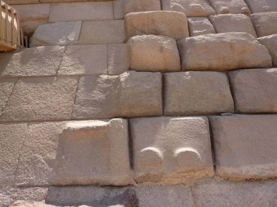 Many stones in ‘Inca’ walls have strange protuberances or bosses, of several shapes and sizes, which appear to mar the beauty of the masonry. They are generally found on the lower part of blocks that have been fitted. It is commonly assumed that they were used in handling the blocks, perhaps by attaching ropes to them or applying levers against them. Blocks at the quarries tend to have large protuberances whereas blocks that have been fitted, or are found lying around at Inca construction sites, or were abandoned along the route from the quarry have much smaller protuberances. The latter could not have had ropes tied to them; what’s more, the positioning of the protuberances seems rather random. Since they were clearly not needed for transportation or for handling the blocks at the building sites, and were not always removed once the blocks were in place, they may have had some symbolic function. Similar protuberances can be seen on blocks in the Osireion temple at Abydos, Egypt, and on some of the granite casing stones used on the lower part of the Third (‘Menkaure’) Pyramid at Giza.