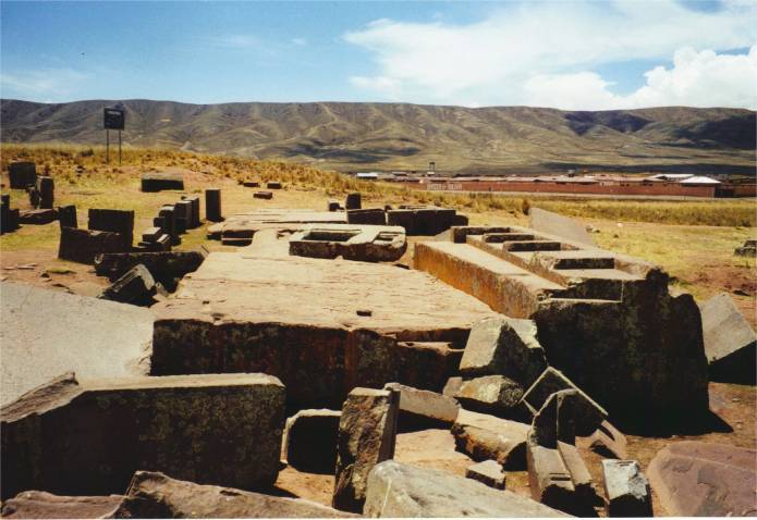 The official view today is that the structures at Tiwanaku and Puma Punku were built between the 2nd and 9th centuries AD, often in several stages. In the early 20th century Bolivian archaeologist Arthur Posnansky put forward a far more radical scenario. He assumed that the Kalasasaya was designed so that, viewed from the middle of the western wall, the sun would rise over the megaliths in the southeast and northeast corners of the temple at the summer and winter solstices respectively. For that to happen, the tilt of the earth would have to be 23°08'48" (or 23°09'54" according to a recent recalculation), whereas it is currently 23°26'21". Based on the current scientific theory that the earth’s tilt oscillates between about 21.6° and 24.6° over a period of 41,000 years, Posnansky calculated that the solstitial alignments would have occurred around 15,000 BC, but later reduced this to 10,000 BC. More recently, Neil Steede has proposed a date of 7000 BC.6 According to theosophy, the tilt of the axis gradually moves through a complete 360° at the rate of 4° per precessional cycle of 25,920 years.7 This would put the date of the solstitial alignments at approx. 865,000 BP! But it is by no means certain that Posnansky’s basic premise is correct, or that the reconstructed Kalasasaya matches the original.