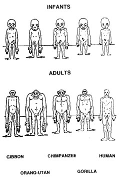 Fig. 5.4. Changes in body proportion in humans and apes. Max Westenhöfer argued that if we don’t hold any preformed opinion, this diagram rules out a simian ancestry for man.6 Apes’ forelimbs are longer than their hindlimbs as a result of specialization to life in the trees.