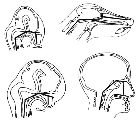 Fig. 5.3. Representation of the angle between the facial skeleton and the skull base in a dog (above) and a human (below), showing the fetal stage (left column) and the adult stage (right column).3