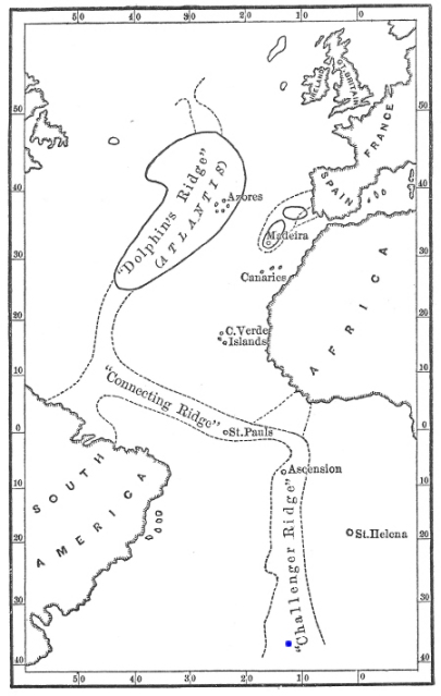 The mid-Atlantic Ridge, as presented by Ignatius Donnelly (Atlantis: The antediluvian world, 1882, p. 47), based on deep-sea soundings made by the Dolphin, Challenger, and other ships. Blavatsky refers to this map at the end of the above quotation (SD 2:333). The blue dot indicates the location of Tristan da Cunha.