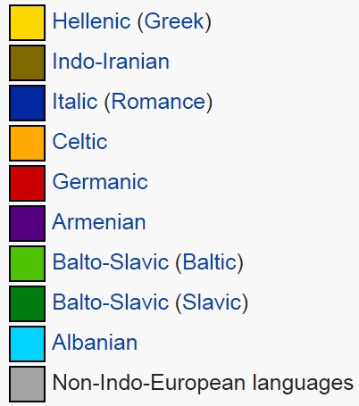 Fig. 7.1. The approximate present-day distribution of Indo-European language branches in Europe and Asia. Dotted/striped areas indicate where multilingualism is common. (en.wikipedia.org)