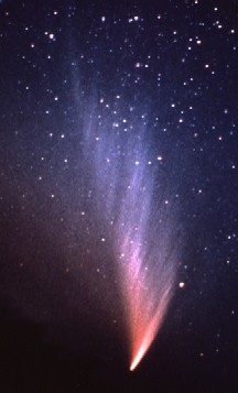 The spectacular dust tail of Comet West, as it appeared in predawn twilight in March 1976. The tail’s delicate, lacy structure is created by countless dust particles shed from the nucleus over many days.6