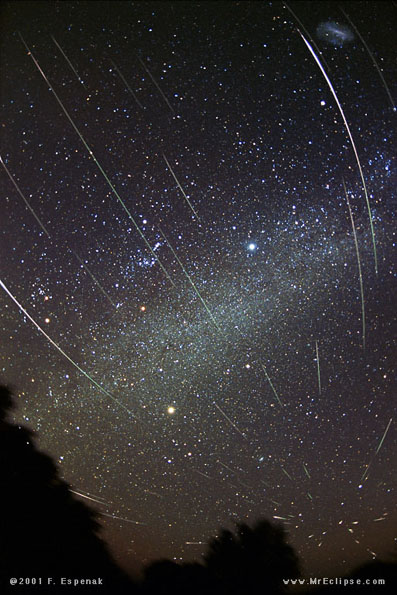 Dozens of the brightest Leonid meteors are captured in this 72 minute composite made from 8 exposures using a fisheye lens. The meteor shower radiates from the sickle shaped string of stars in Leo (lower right). (Copyright 2001 by Fred Espenak, MrEclipse.com)