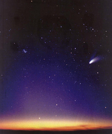 The zodiacal light – a stunning wedge of cosmic dust – is shown here framed by the Pleiades (upper left), Comet Hale-Bopp (upper right), and Mercury (left of centre along the horizon).3
