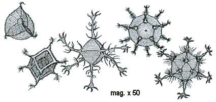 Fig. 4.6 The platonic solids have been found living in the sea. The tetrahedron, somewhat rounded as if from internal pressure, is embodied in a protozoan called Callimitra agnesae, the cube is Lithocubus geometricus, the octahedron Circoporus octahedrus, the dodecahedron Circorrhegma dodecahedrus, and the icosahedron Circognia icosahedrus.