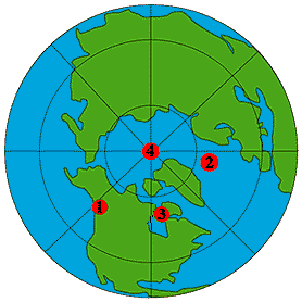 Fig. 1. The three previous positions of the north pole according to Hapgood: 1 - Yukon, 2 - Greenland Sea, 3 - Hudson Bay.