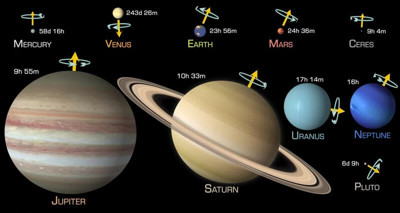 Fig. 1. Axial tilts, rotation periods and relative sizes of the eight planets and two dwarf planets (Pluto and Ceres).