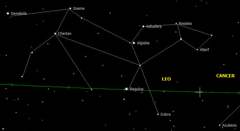 The cross on the ecliptic between ‘Leo’ and ‘Cancer’ shows where a line drawn from the