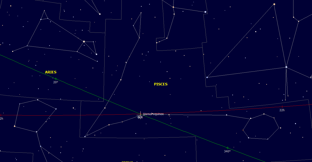 Position of the sun at the vernal equinox in 2022, showing the celestial equator (red) and the ecliptic coordinate grid (green). (CyberSky 5.2)