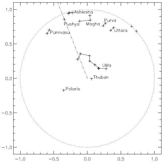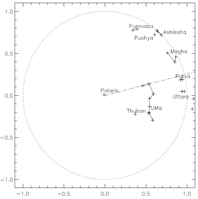 Sule et al.’s approach differs from Indrasena’s in that the saptarishi pointer does indeed move through the sidereal nakshatras due to precession. But it is unsatisfactory because the pointer does not move through all the nakshatras in the course of a precessional cycle, but back and forth through only four or five of them, spanning about 60 degrees (this can be seen by drawing a line from any point on the precessional path of the celestial pole through the midpoint between Dubhe and Merak). Moreover, the pointer can take from a few hundred years to over 1000 years to pass through a nakshatra, depending on how close the celestial pole is to Dubhe/Merak (the closer it is, the less time it takes) and on the exact width of each nakshatra.