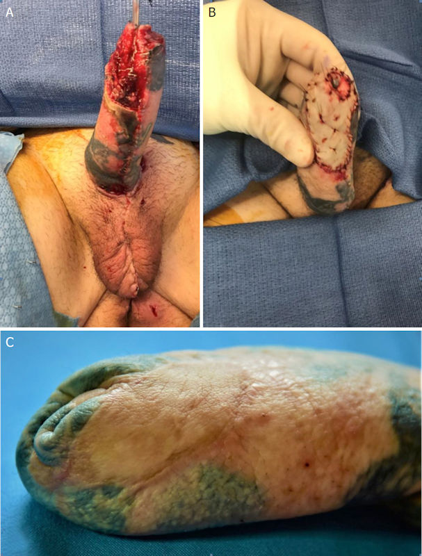 Repairs to a fake penis that has suffered ‘partial flap loss’. A: dead or damaged tissue