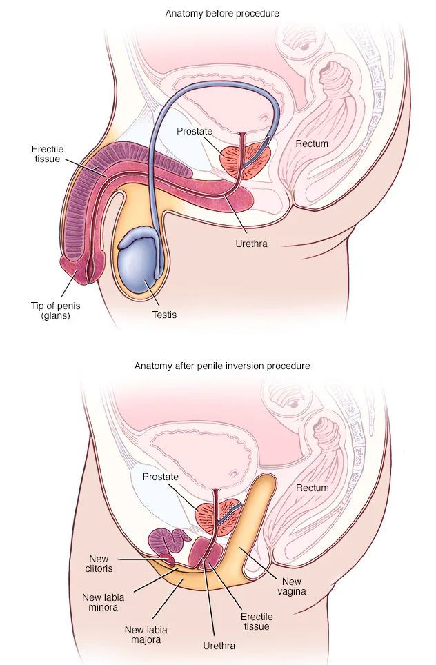 Penile inversion is one method of making a fake vagina (vaginoplasty). Surgeons make a cut between the rectum and the urethra and prostate, and use skin from the scrotum and penis to create a ‘vaginal’ canal. Patients have to regularly insert a dilator into the canal for the rest of their lives to stop it from narrowing or closing, as the body tends to see it as a wound. Initially, this has to be done several times a day, and can be painful and messy. (mayoclinic.org)