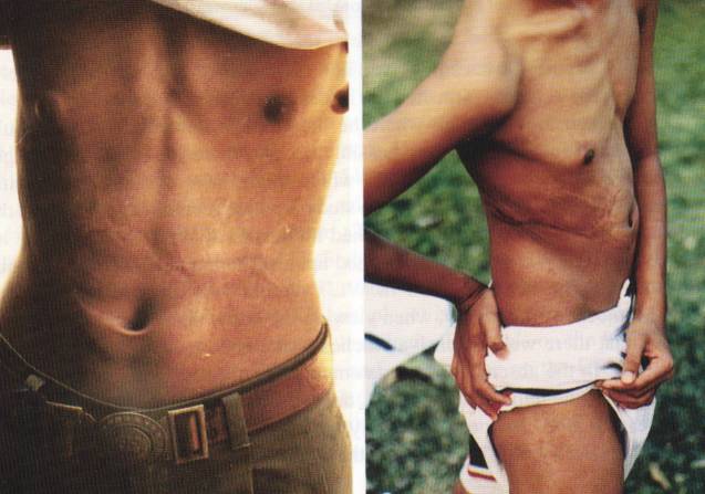 AL was born in 1983 near Loei in northeastern Thailand. Shortly before his mother became pregnant with him, she had a dream in which her deceased father-in-law, WL, said that he wished to be reborn as her child. WL had been fatally injured in a vehicle accident in 1981, when he was 64 years old. A motorcycle hit his trailer and the impact knocked him off his bicycle and resulted in him being dragged on his abdomen for some distance. At least one handle of the bicycle became driven into his abdomen, and he bled profusely. The photos below, taken in 1997, show extensive areas of increased pigmentation and scarlike appearance on AL’s abdomen and lower chest. Whether reincarnation is the explanation in this case is not certain as AL never spoke about a previous life. Once when he was shown a photograph of WL, he looked at it for a long time, smiled, but said nothing (Pasricha et al., 2005).