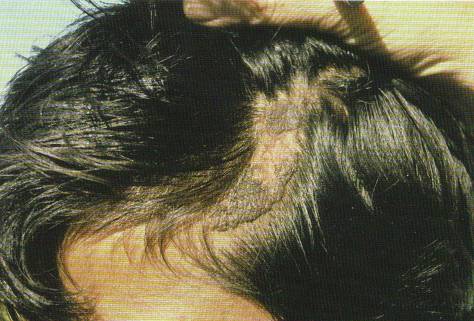 Nevus on NK’s head (1998), showing hairless, wrinkled skin with areas of unusual roughness.