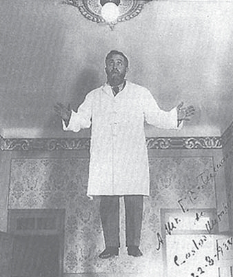 Mirabelli used to levitate and remain floating for minutes at a time. At one sitting, a chair with Mirabelli in it rose two metres into the air and stayed there for two minutes. At another, three knocks came from a table and a child’s voice cried ‘Papa’. One of the investigators recognized it as his daughter’s, who had just died of influenza. Her form gradually materialized, in the dress she had been buried in, and her weeping father embraced her. Apart from looking deathly pale, she seemed to be just as she had been when alive, and she conversed with her father for half an hour in a sad, monotonous voice. She was photographed before floating into the air and dematerializing. The following then happened: