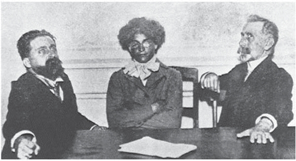 The look of alarm on the face of Dr Carlos de Castro (right) is due to the fact that a deceased poet, Giuseppe Parini (centre), has just materialized between him and the entranced Mirabelli (left), in the course of a test seance at the Cesare Lombroso Academy of Psychical Studies. (Braude, 2017)