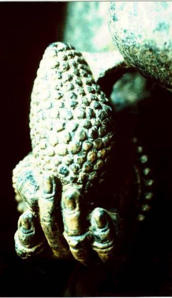 The caiman of Mesoamerica corresponds to the mythical makara of India, an amphibious creature variously portrayed as a crocodile-fish, a creature with the head and forelegs of an antelope and the body and tail of a fish, a creature with an elephant’s head and fish’s body, and a dolphin or shark. The makara is associated with the creation of the world, and is often depicted disgorging human heads, deities, lotuses or other elements of creation; alternatively, a hero or deity is sometimes shown defending himself from its jaws. The makara is sometimes depicted vertically, with its head at the bottom. All these motifs are widely found in Mesoamerica. In addition, the makara, caiman and related Mayan kawak (cauac) or ‘earth monster’ sometimes have a curved, upturned snout, and also a trefoil, which has been interpreted as representing the triune qualities of ‘divine breath’.15