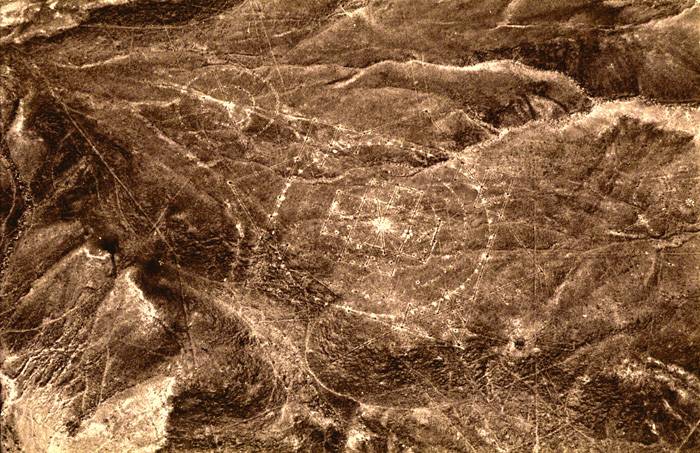 Fig. 4.20 The ‘mandala’ consists of three interconnected glyphs, carved with great precision on a remote plateau in the Palpa mountains (14º 38.65' S, 75º 10.27' W), not far from Nazca. The central circle, about 55 m in diameter, is enclosed by a square of the same width and by a second, slightly larger square, tilted diagonally with respect to the first. Within the circle are several smaller circles, and in the middle are two superimposed rectangles, each divided into eight squares (click here for a sketch). The various circles are marked by small holes, sticks, or stones. A geological cleft runs through the middle of pattern. On either side of the main circle is a smaller set of concentric circles (only one set can be seen in the photo). Straight lines join various parts of the geometrical patterns.12