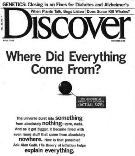 The front cover of the April 2002 issue of Discover magazine. Beneath the heading ‘Where Did Everything Come From?’ is a picture of a large red marble, with the caption: ‘The universe at about 10-34 seconds (ACTUAL SIZE)’. The marble measures 2 centimetres in diameter. The text beneath it reads: ‘The universe burst into something from absolutely nothing – zero, nada. And as it got bigger, it became filled with even more stuff that came from absolutely nowhere. How is that possible? Ask Alan Guth. His theory of inflation helps explain everything.’ Cosmologist John Barrow, on the other hand, believed that at the moment of the big bang, the universe was not of zero size but was an incredibly dense ball 6 millimetres in diameter. This is better than nothing – but still garbage!