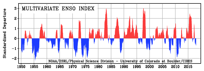 Fig. 3.10 Above: El Niño (top) and La Niña (bottom), together called ENSO, involve warmer-than-normal and cooler-than-normal sea surface temperatures in the equatorial Pacific Ocean, which affect weather patterns around the world by influencing high and low pressure systems, winds and precipitation (esrl.noaa.gov). Below: ENSO index (esrl.noaa.gov).