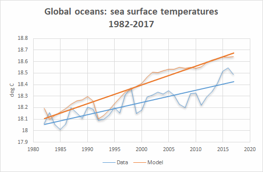 The commonly heard claim that climate models are based purely on ‘physics’ is false. A great deal of arbitrary tuning or calibration is required. If climate science was truly settled, there would be one model, and it would match reality. Instead, there are over 100 different models, each tuned differently, but they can all approximately reproduce the temperature trend over the past century, since that is what they have been designed to do. They produce very different simulations of 21st-century climate, but observations show that, overall, they have a notable tendency to exaggerate warming. In 1990 the IPCC predicted a warming rate of 0.3°C per decade for the next century, whereas the observed rate from 1990 to the end of 2017 was 0.165°C per decade (HadCRUT4).
