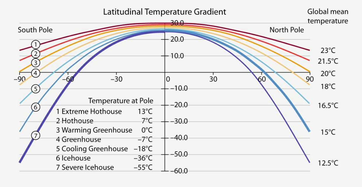 Pole-to-pole curves of latitude versus temperature for climatic conditions ranging from extreme hothouse to severe icehouse, together with the average global temperature. The current climate is represented by curve 7 for the southern hemisphere and curve 6 for the northern hemisphere (thick curves). (Vinós, 2023, ch. 9)