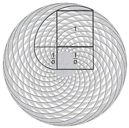 Fig. 8.5 Sunflower, Woodborough Hill, Wiltshire, 13 August 2000, made out of 308 triangles of standing crop. It is 73 metres wide, and composed of 44 spirals based on phi (φ) or the golden mean (ratio 1:1.618), a spiral that is difficult to draw, even on paper (Silva, p. 111). The golden mean is a proportion found throughout the animal and vegetable kingdoms.
