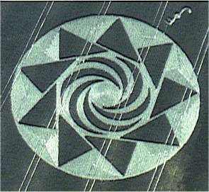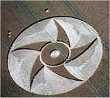 Intricate crop lays presented further problems. In one 54-ft-diameter circle, for example, the plants were whirled in standard clockwise motion, but this time laid toward the centre, with a thin band around the perimeter swirled anticlockwise and pointing away from the centre. Furthermore, when the stems were lifted, a second layer was found underneath, flattened counter to the top one. Meaden stuck to the weather explanation, arguing that the whirlwind had abruptly switched its rotation direction. The circlemakers later replied by creating a formation with two annular rings around a circle, each element in contra-rotation to the next.