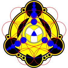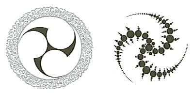 The spiral-shaped Stonehenge glyph (fig. 3.11) can represent several things: the computer-generated fractal known as the Julia Set; the base clef symbol used in musical notation; the spiral shape found in the nautilus shell and many other natural forms; and a mammalian skeleton with the correct number of vertebrae. Some have likened the interlocking spiral motif of the Triple Julia Set (fig. 9.1) to the Tibetan Buddhist symbol called the ‘wheel of joy’ (or gakyil), which symbolizes the primordial energy and also the three stages to enlightenment spoken of in Dzogchen teachings.