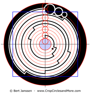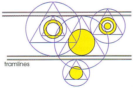 Fig. 8.2 The positions and sizes of all the elements of this crop formation (Oud-Beijerland, the Netherlands, 1998) are harmoniously related to one another and/or to the tramlines, in accordance with Hawkins’ theorems. Flattened crop is coloured yellow. (Janssen, 2004, pp. 83-4; Haselhoff, pp. 61-3)