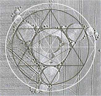 Spirals, triangles, pentagons and pentagrams, hexagons, heptagons, octogons, etc. are all found in crop formations, each with its own symbolic connotations. An equilateral triangle, for example, can represent completion. Three-dimensionally it becomes the tetrahedron (four-sided pyramid), a key hermetic symbol, and a prime bonding pattern of matter. One of its best-known crop-glyph representations is the 1991 Barbury Castle tetrahedron (fig. 3.6). In ancient alchemy, balls on the tips of a tetrahedral triangle signify the three prime alchemical elements: salt, sulphur, mercury. The five-pointed star or pentagram (which, like the pentagon, displays the golden-mean ratio) symbolizes the human being, since a human figure with outstretched limbs fits within it. The six-pointed star or interlaced triangles (also known as Solomon’s seal or the sign of Vishnu) represents universal spirit and matter.