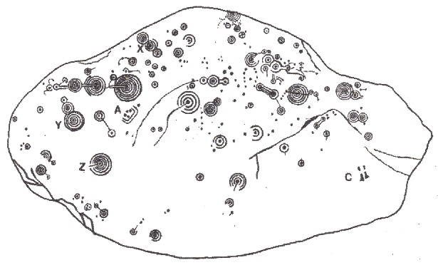 Fig. 12.2 Prehistoric rock carvings on a now buried stone at Cochno, near Bearsden, Scotland (Collins, 2009, p. 95). Basic crop-circle designs such as concentric rings linked with lines are common in megalithic art.
