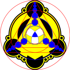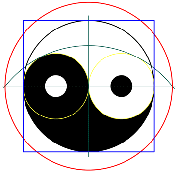 Fig. 12.10 Triple yin-yang, Grey Wethers, Marlborough Downs, Wiltshire, 14 July 2009. The yin-yang symbol represents the balancing of opposites; duality is fused into unity. As shown below, it also encodes the squaring (blue) of the circle (red) (cropcirclesandmore.com).