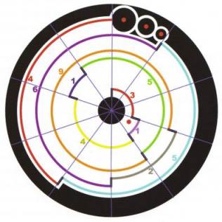 Fig. 12.8 Beautiful ratchet spiral, Barbury Castle, Wiltshire, 1 June 2008. As shown below, the design encodes the value of pi (π), 3.141592654... The circle is first divided into 10 slices of 36º. Starting from the central circle, the first segment of the spiral passes through three slices, signifying the number 3; at the end of it is a small circle, representing a decimal point. Subsequent segments of the spiral represent the numbers 1, 4, 1, 5, 9, 2, 6, 5, 4 (the 10th digit of pi is really 3, but is rounded up to 4 because the next number is 5). The spiral ends with a series of three small rings, representing an ellipsis, indicating that pi is an irrational number that continues ad infinitum (Glickman, 2009, ch. 12).