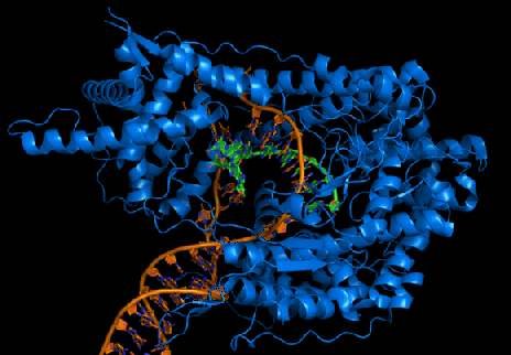 Below: The enzyme T7 RNA polymerase (blue) producing mRNA